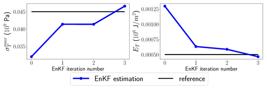 The data assimilation algorithm, described in Figure 3, is validated using model-generated synthetic observations. This is performed with a HOSS setup to simulate the SHPB experiment described in Section 3. The synthetic observations experiment, referred to as a twin experiment, consists of selecting a set of “reference” parameter values for and , from which a HOSS model simulation for the SHPB is generated and used to get synthetic observations. In this case, the observations are the stress versus time curve generated from this reference HOSS simulation. Afterwards, an EnKF assimilation experiment is performed using these SHPB synthetic observations. To validate the EnKF assimilation method if the estimated parameters provided by the EnKF are close to the “reference” parameters chosen to generate the synthetic data, then the assimilation method is validated, since it provided the correct parameter values for this synthetic observation experiment.