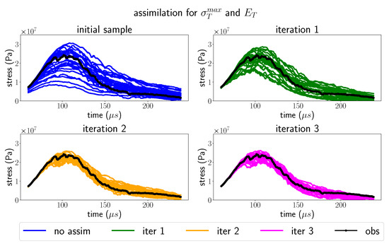 From our twin experiments shown in Section 5.2, three EnKF assimilation iterations are needed to estimate a fairly accurate parameter value for and . The observations are composed of a series of stress versus time points obtained from a SHPB laboratory experiment. The results show a good convergence for , where the assimilation provides a parameter value of around 0.15 (see Figure 6). For , the assimilation is able to hone in to the most likely value. This might not be the case for , where the assimilation provides a monotonically decreasing parameter value. Given that no strong suggestion of convergence is seen in this parameter value, it is difficult to conclude that the final value provided in the third iteration of the assimilation is the most likely parameter value for this SHPB observations.