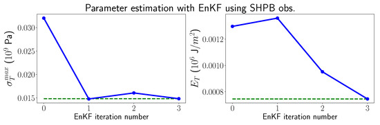 Estimated parameter values for and provided by the EnKF data assimilation using SHPB time–stress curve observations, where the blue line is the average parameter value at each iteration, and the green dashed line is the final value at Iteration 3. The EnKF is applied three times, each time providing an estimated parameter value. The assimilation provides a consistent estimate for , where the parameter value is seen to converge around 0.15. In the case of , the assimilation seems to be providing monotonically decreasing values of the parameter value, which might not be reliable.