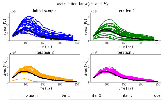 Time–stress curves for each assimilation iteration, starting with the initial ensemble of 25 members (top-left plot, blue lines), first assimilation iteration (top-right plots, green lines), second iteration (bottom-left plot, yellow lines), and third iteration (bottom-right plot, magenta lines), as well as the observations (black line in all plots).