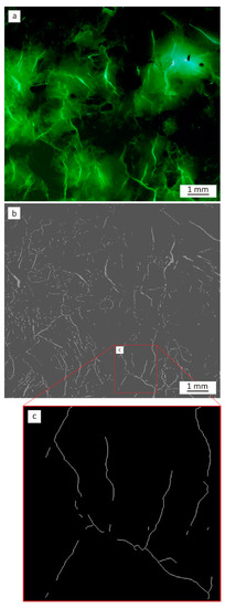Example of (a) a fluorescent image of the microfracture network; (b) the resulting segmented image; and (c) a close up of the skeletonised image. Adapted from Kovács et al. [5,13].