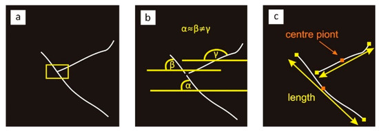 Examples of: (a) schematic skeletonized image; (b) branch point detection of the intersecting fractures; and (c) division to individual objects. Identification of the end points (marked with yellow) and centre points (marked with orange). Adapted from Kovács et al. [13].
