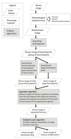 Images were processed using the Trainable Weka Segmentation plug-in of the ImageJ-based Fiji environment [31], which allowed the images to be simplified and reduced to two types of pixels: fractures and host rock. Examples of a fluorescent image, segmented image, and then skeletonised image are shown in Figure 3. The images were further processed in MATLAB, and then geometric parameters of the microfracture networks were extracted from the images using an algorithm that was developed for this purpose (Figure 4). The algorithm detects the branch points of the intersecting fractures, and based on the dip of the fractures to a reference line, it divides them into separate linear objects. This allows the end and centre points of the individual fractures to be detected. Based on the data sets of these points, the algorithm calculates the length and orientation of the fractures. The geometric parameters of a fracture set, such as the fracture length index and fractal dimension, were then determined as shown in Section 2.4.1. A basic overview of the process workflow is shown in Figure 5.