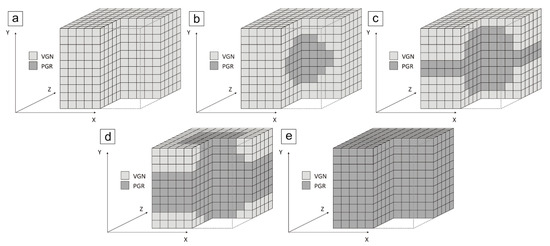 Schematic image of the models consisting of both pegmatoid granite (PGR) and gneiss (VGN). Volumetric content of PGR increases with 25% increments (a–e). The size of the models is 10 m × 10 m × 10 m.