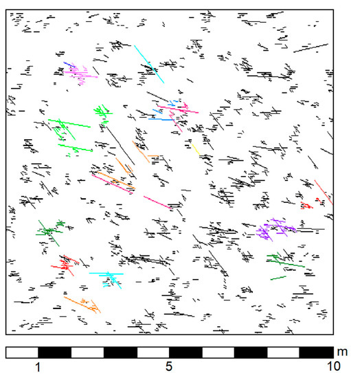 Example of the visualized results of modelling in a 2-D section of a model with 75% pegmatoid granite and 25% gneiss. Coloured fractures compose connected clusters. Size of the image is 10 m × 10 m.