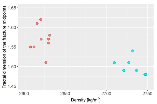 Density vs. the fractal dimension of the fracture midpoints, D. Red is pegmatoid granite, blue is gneiss. Adapted from Kiuru et al. [4].