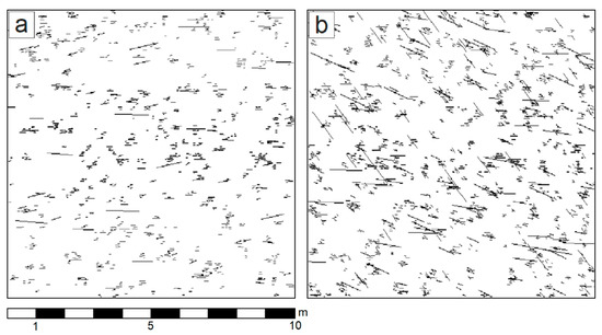 Example of the resulting fracture networks: (a) gneiss (VGN); (b) pegmatoid granite (PGR). Size of the images is 10 m × 10 m.
