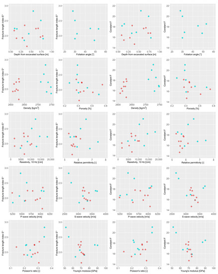 To study possible associations between the physical properties and fracture network parameters, cross plots of select variables were made. The fracture length index E*, the constant F, and the fractal dimensions of the system (Df) and as determined at fracture midpoints (D) were plotted against the specimen depth, foliation direction, density, porosity, resistivity, relative dielectric permittivity, P- and S-wave velocities, P/S-ratio, Poisson’s ratio, and Young’s modulus (Figure 11).