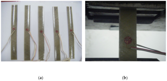 Setup of the filament winding FRP (FFRP) tensile test: (a) specimen, (b) attachment of strain gauge.