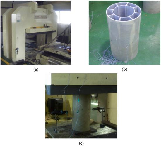 Compressive strength experiment of PFRP−FFRP. (a) Compression tester with a capacity of 30,000 kN. (b) Experimental PFRP-FFRP specimen of φ300 × 600. (c) Experimental test setup.
