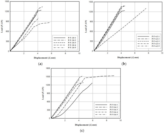 Load–displacement relationship of PFRP−FFRP. (a) P−F−2.8. (b) P−F−4.2. (c) P−F−5.6.
