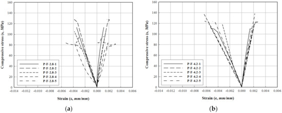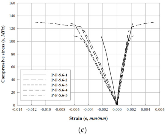Stress–strain relationship of PFRP−FFRP. (a) P−F−2.8. (b) P−F−4.2. (c) P−F−5.6.