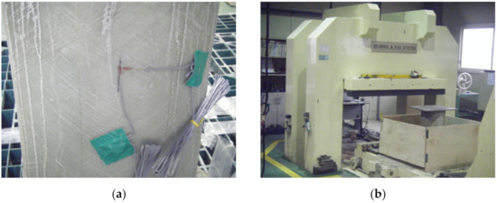 Compressive strength testing of the hybrid-CFFT: (a) gauge installation and (b) testing equipment.