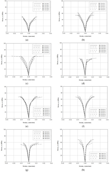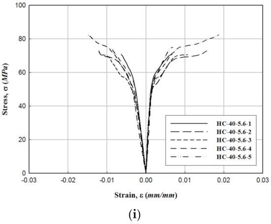Stress–strain relationship of the hybrid−CFFT: (a) HC−21−2.8, (b) HC−21−4.2, (c) HC−21−5.6, (d) HC−30−2.8, (e) HC−30−4.2, (f) HC−30−5.6, (g) HC−40−2.8, (h) HC−40−4.2, and (i) HC−40−5.6.