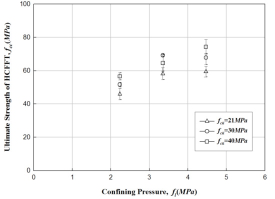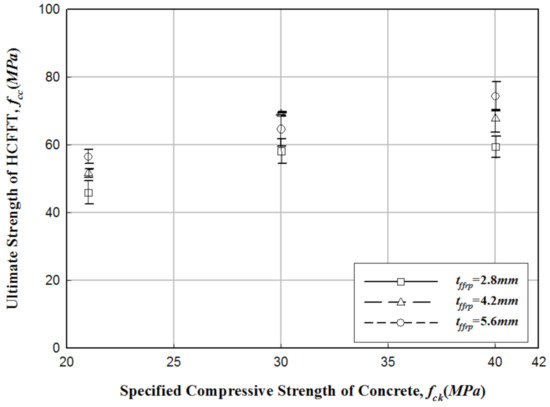 | Concrete Design Strength (fck, MPa) | FFRP Thickness (tf, mm) | Ultimate Strength (MPa) |
