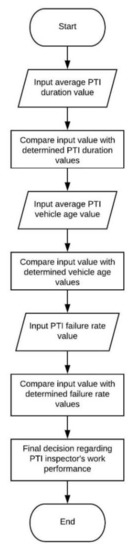In order to determine the significance of the research at the very beginning, it is necessary to conduct an adequate statistical analysis to determine the significance and correlation of the observed parameters with regard to the vehicle’s roadworthiness. The main purpose of the proposed ES is to improve the decision-making regarding employee work performance in order to provide rapid and objective decisions. As the objectivity of the PTI system is extremely important for road safety, the work of PTI inspectors, who are the key factor in making a decision regarding the vehicle’s roadworthiness, needs to be analyzed. Legal regulations and professional instructions are the basis for evaluating PTI inspectors’ performance. Thus, the aim of the proposed ES is a proposition of correct decision regarding PTI inspectors’ performance based on entered work performance values, all in order to reduce potential manipulations and unprofessional work to a minimum. Furthermore, the proposed ES could determine PTI inspectors’ work quality by comparing performance values regarding average PTI duration, average vehicle age, and PTI failure rate (Figure 1) with their reference values.