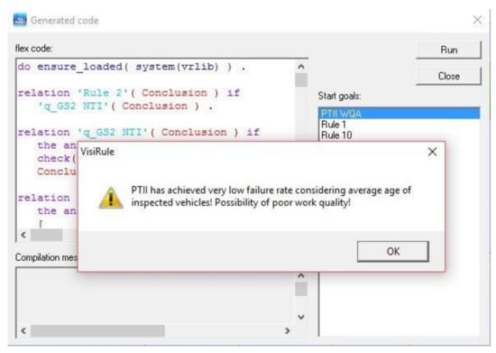 The basis for generating ES rules that represent knowledge was primarily legal regulations, standards prescribed by professional instructions, and average values of the observed sample. In addition, the intervals of individual parameters based on experience have also been taken into consideration. Based on the established and designed rules, a support model was designed within the decision-making process about the PTI inspectors’ performance evaluation. Within the VisiRule shell, a total of 14 rules were designed, consisting of three levels and suggesting 47 possible decisions (see Figure 2).