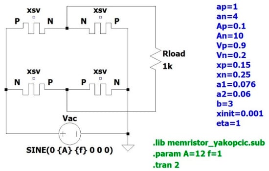 The circuit of the memristor-based rectifier bridge simulated in LTspice is shown in Figure 2. A sinusoidal voltage source with variable amplitude A and frequency f acts as the excitation (the input signal). A simple 1 kΩ resistor acts as a load. The voltage of the resistive load is the output signal. At a positive half period of the sinusoidal input voltage, the memristance of the two P-xsv-N memristors (see Figure 2) is decreasing, while the memristance of the two N-xsv-P memristors is increasing until saturation is reached. At a negative half period of the input voltage the process is reversed. During one period there is a change of processes between both memristances. Thus, in the ideal case the output voltage is only positive, and this pulsed voltage has double the frequency of the input signal. In the real case there are the temporary short negative voltage-time areas in the output signal, due to the time shift in the state variable change. The circuit comprises memristors described by the Yakopcic model. The parameters of the Yakopcic model are represented in LTspice and have the following values: , , , , , , , , , , , , [54,55]. The equations of the memristor model are implemented in a sub-circuit called memristor_yakopcic.sub. The Yakopcic model will be explained in detail below. The directives (.param and .tran) seen in Figure 2 are only used as an example.