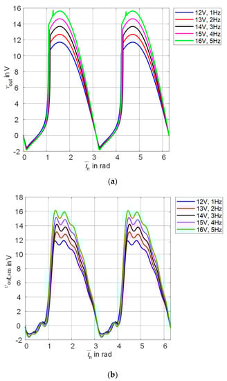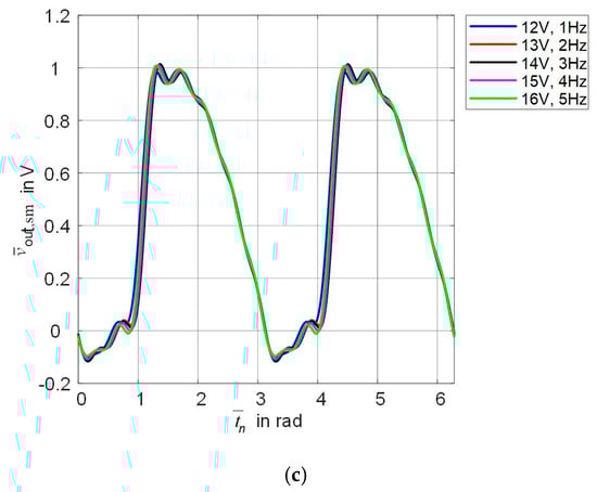 For the investigation of the rectifier, we have set the input signal parameters to the amplitude/frequency pairs (12 V/1 Hz), (13 V/2 Hz), (14 V/3 Hz), (15 V/4 Hz) and (16 V/5 Hz). The time window for simulation was set depending on the frequency and the number of signal periods . We have chosen in order to let startup transients settle. The LTspice output signal does not have equally spaced timestamps, as the program adjusts the time steps automatically dependent on the temporal derivative of the signal. Only the final period of the output voltage was kept for post-processing. For interpolation we used equally spaced samples. As a final step, all waveforms were normalized to the same angular frequency . By this the different maxima and minima are aligned.