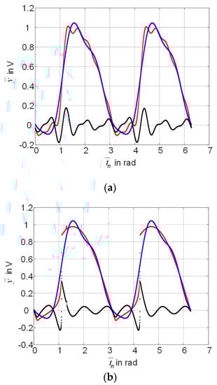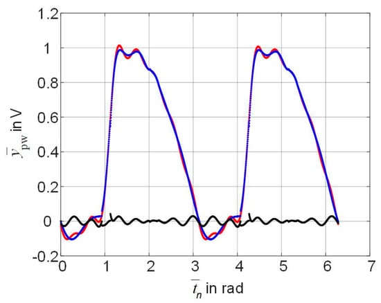 For the 3rd trial input signal, as shown in Figure 5a, the blue curve is the response of polynomial (11) of the 6th power, the red curve is the smoothed output signal , the black curve is the uniform error from Equation (12) in the range . Figure 5b shows correspondingly the response of the split polynomial, the non-smoothed load voltage , the uniform error obtained without smoothing by the low-pass filter. By comparing Figure 5a with Figure 5b, it can be seen that the non-smoothed output signal is described with a significantly greater error (black curve) than the smoothed output signal.