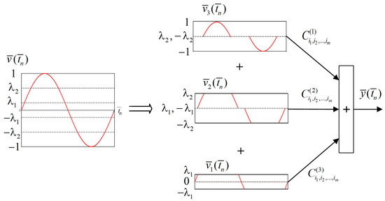 To construct a piecewise polynomial model of the rectifier, we divide the range of the normalized modulus of the input signal amplitude into several sub-ranges. The thresholds of the sub-ranges we denote as . The input sub-signals correspond to the mentioned amplitude sub-ranges, and every input signal is described by the sum