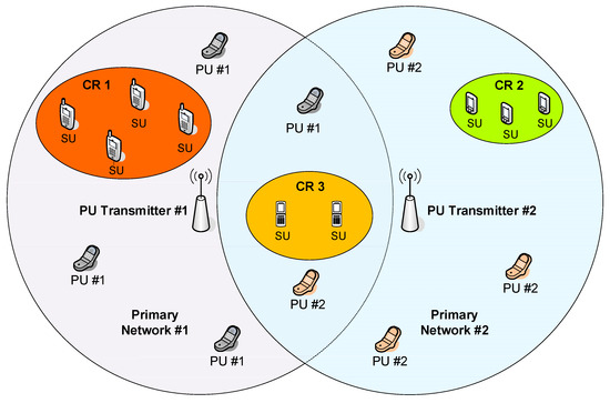 The generic idea of the coexistence between PUs and SUs is shown in Figure 1. Two primary networks are composed of PU transmitters and sets of PU receivers (PU #1 and PU #2). The range of Primary Network #1 is presented in purple color, while the range of Primary Network #2—in blue-grey color. There are three exemplary CR networks that do not overlap. CR 1 network is deployed within the range of Primary Network #1, while CR 2 network within the range of Primary Network #2. CR 3 network is arranged in the area that is covered by the ranges of both PU Transmitters. In general, SUs are allowed to use resources assigned to PUs operating in the same area, however, they must obey a set of specific rules to avoid disturbing PUs. As a minimum, cognitive radios have to know the transmission pattern of PUs or have to recognize the transmission from PUs.