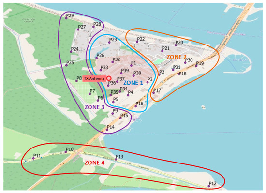 The area presented in Figure 2 was divided into four zones that reflect the distance of the sensors from the TX antenna and the signal levels measured by the sensors. Zone 1 represents the sensors located around the TX antenna with the received signal level higher than −90 dBm. Zone 2 includes sensors that measured a signal lower than −90 dBm and were deployed east of the TX antenna. This zone is an example of an urbanized area. Zone 3 also contains sensors with the signal level lower than −90 dBm, but located west of the TX antenna. This zone represents partly forested and partly rural area. Zone 4 was created at the bottom of the map and exemplifies a distant area at the edge of the radio range. All the sensors within this zone measured very low signal levels, lower than −100 dBm. This division of sensors into four zones was used in our further analysis.
