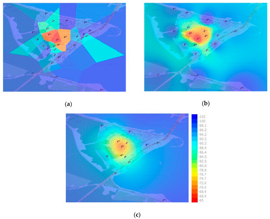 Exemplary maps constructed for selected interpolation techniques and various number of sensors (signal level in dBm): (a) 26 sensors—Nearest Neighbor (NN); (b) 20 sensors—Inverse Distance Weighting (IDW) p3; (c) 13 sensors—Kriging.