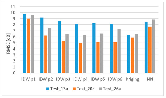It should be emphasized that, independently of the scenario, IDW p1 and NN interpolation techniques offered the highest RMSE, which also means the worst REM quality. The highest values of RMSE observed for NN and IDW p1 resulted from high uncertainty in estimating the signal level, even above 20 dB, which is a significant difference when compared to the other interpolation techniques. This effect results from a sudden and deep change in the interpolated signal level between neighboring areas. Consequently, even if the number of miscalculated estimations is low, the range of errors of estimation makes the value of RMSE high. For this reason, these methods should not be recommended for REM construction.