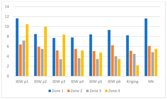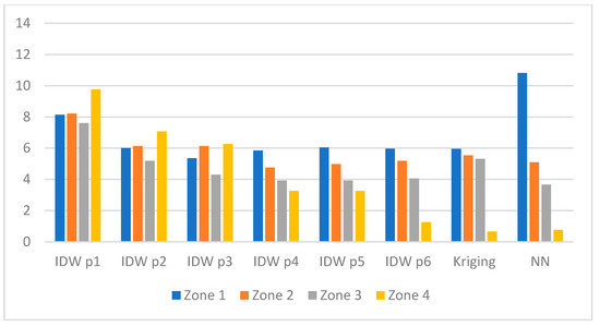 where hi is the distance between point xi and point x0, hk are distances between points xk and point x0, and p is the power. Usually, in the literature on the topic, the power p is set to 1 or 2. In our research, we have taken into account the power p up to 6. In the rest of the paper, we use the following notation for IDW method: IDW pα where α is the value of the power p, e.g., for IDW p3 the value of the power is equal to 3.