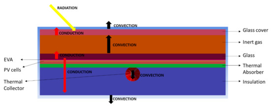 Conceptualization of the layers of a PVT panel and the different forms of heat transfer inside it.