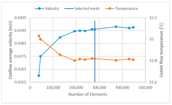 The skewness of a mesh element is related to the angles between its edges. A distorted mesh cell does not generate accurate results. The volume of elements should approximate as possible to a spherical body. Skewness coefficient is calculated as the ratio between the difference of the volumes of the optimal body and the real body and the optimal body volume. An excellent coefficient value of skewness is near 0. Quality analysis of the mesh has been performed before the thermal analysis of the PVT and PVT+TEG models. Solutions obtained from different mesh sizes of the simulated model have been evaluated to select the suitable mesh for this system. In Figure 2, the comparison of the average outlet temperature and the average outlet velocity of the working fluid from the PVT panel with the mesh size can be consulted. Quality analysis of mesh has been performed under these work conditions: solar irradiation of 1000 W/, a fluid inlet temperature of 30 °C, the mass flow of 0.02 kg/s, and an ambient temperature of 30 °C. An increase in the number of mesh elements from 195.000 to 448.000 implies a variation of 0.070% and 0.031% in average outflow velocity and average outflow temperature, respectively.