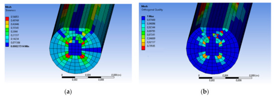 Once the physical 3D model (Figure 1) that is going to be simulated is presented, a mesh must be done. The meshing is the process whereby the discretization of the geometry is performed. The selection of the mesh’s method and size must be governed by a balance between quality and processing capacity. The quality of elements can be measured with different throw parameters. The selected parameters to analyze and evaluate mesh quality in the studied model are skewness and orthogonal quality [46].