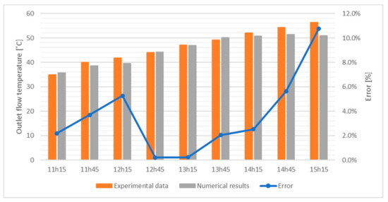 The PVT and the PVT+TEG models have been validated through experimental data collected on the test bench. Figure 4 (conventional PVT panel) and Figure 5 (PVT + TEG panel) show the comparison between the numerical results obtained from the software Fluent-ANSYS and the experimental data of the outlet flow temperature of both panels. As can be observed, numerical results are nearly equal to the experimental ones.