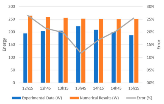 The error between numerical and experimental data does not exceed 13.6%. Except for the test made at 10:45 AM. At this time, error achieves the value of 38.0% and 42.7% in the simulation of a conventional PVT and in that of a PVT + TEG panel, respectively. The mass flow of the working fluid at this time is 0.39 g/s. This value is low. Additionally, it is observed in both Figure 4 and Figure 5 that the increment in the error at 15:15 a.m. At this time, low flow is not the source of error. Analyzing experimental data from both hybrid panels, it can be concluded that the flow is on a transient scenario because impulsion pump goes into operation few minutes before the capture of data. The finding suggests that the elaborated model has limited application with low mass flow experiments and transient situations. Besides, the electrical production of cells embedded on the PVT panels has been validated. The comparison between experimental results and numerical results is shown in Figure 6. In some of the studied moments, the error between real and simulated data is not negligible as it can be observed; its source is related to the incident solar radiation and the ambient temperature. A correction in the calculation has been applied to reduce this error and achieve coherent results in further analysis. The correction factor applied in each range of solar radiation can be seen in Table 5. Electric production of PVT panels calculated with these corrections has a maximum error value of 10% concerning experimental results.