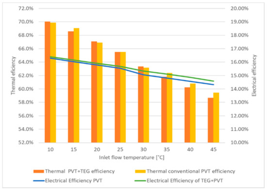 Figure 7 shows the thermal and electrical performance of the considered photovoltaics-thermal panels with the variation in the inlet flow temperature. The thermal efficiency of both systems decreases with the increment in the inlet temperature. Additionally, electrical efficiency also displays a reduction. Thermal production of conventional PVT panel is on average 0.2% superior to PVT with integrated TEG modules. The electrical efficiency of TEG modules varies from 0.31% to 0.11%. The highest TEG’s efficiency is achieved when the inlet flow temperature is 40 °C. In contrast, the higher thermal efficiency is achieve in both panels at the inlet flow temperature of 10 °C. With the integration of the TEGs in the PVT panel, electrical production increases on average 1.37%.
