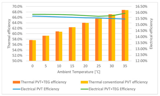 As it can be consulted in Figure 8, the ambient temperature does not affect to electrical production of PV cells of the hybrid panels. Nevertheless, thermal efficiency is positively related to the variation of the ambient temperature. An increase in hot water production is observed when an increment in the ambient temperature occurs. The thermal efficiency of conventional PVT panels with the ambient temperature of 0 °C and 35 °C is 57.5% and 68.6%, respectively. The difference between thermal production of conventional and PVT + TEG panels is insignificant. The electrical efficiency of TEGs modules increases with the increment in the ambient temperature, reaching a maximum of 0.47% at 35 °C. This result makes sense because TEG efficiency is related to the gradient’s increment between sides of the module. These temperatures are related to thermal efficiency too. In this way, it is possible to conclude that an increase in the thermal efficiency of a hybrid panel contributes to the increment in the electrical efficiency of the TEGs modules integrated into the panel. Additionally, an overall electrical efficiency increment is expected as well.