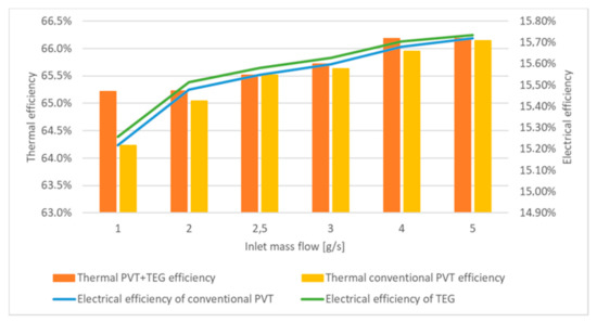 The studied efficiencies of the PVT panels under the parametric analysis that vary the mass flow of the working fluid in the hybrid panels are graphically represented in Figure 9. The reduction of the mass inlet flow under nominal flow supposes an overheating of the PV cells and a reduction in the electrical efficiency of the panels. Electrical efficiency is 15.2% and 15.7%, with a working mass flow of 1 and 5 g/s, respectively. However, this overheating positively affects the TEG modules’ efficiency because of the indifference of temperatures between cold and hot sides of them. In particular, the overall electrical efficiency of a PVT + TEG panel is 1.1% higher compared to a PVT panel with a circulating flow of 1 g/s. Despite the overheating produced in the interior of the hybrid panel with the reduction of the mass flow, thermal efficiency does not show an improvement.