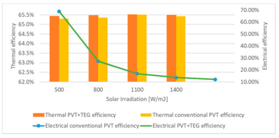 Figure 10 displays the thermal and electrical evolution of the two tested hybrid panels with the variation of the incident solar irradiation. The chart shows that the increase in electrical efficiency of the PVT panels takes place as a consequence of a reduction in solar radiation. In this sensibility analysis, the electrical efficiency of conventional PVT panels varies from 68.9% to 12.1% for incident irradiation in the range 200–1400 W/m2. The efficiency of the TEG modules and thermal efficiency of the panels keep the opposite trend as PV cells efficiency. With more solar radiation, an increase in thermal production is observed. In the mentioned figure, it is not possible to appreciate the difference between electrical efficiency of the conventional PVT panel and the hybrid panel with integrated TEGs. This is because, on average, this difference has a value of 0.02%.