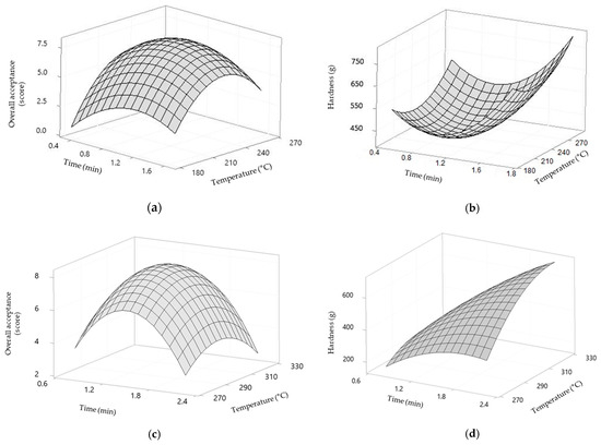 Three-dimensional response surface plots of overall acceptance (a) and hardness (b) of AMPS and overall acceptance (c) and hardness (d) of CSM in a superheated steam roaster using RSM.