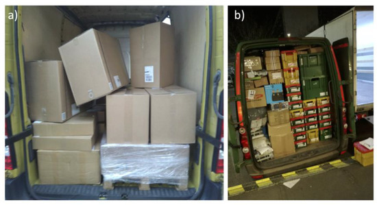 This mode of express delivery brought new circumstances during transportation. The huge amount of goods causes a very intensive flow in the distribution channel by collecting and delivering single and various products day by day. This often means that the operators try to use the most of the vehicle capacity; thereby many identical or different kinds of parcels are stacked on top of each other. This situation is complicated further by the fact that the fixation accessories such as fixing straps or bands are virtually non-existent in this transportation mode. This is a common practice in Europe, but on some continents, this is different because the operators use vehicles equipped with shelves. Figure 1a,b shows some examples for parcel shipments during daily courier service.
