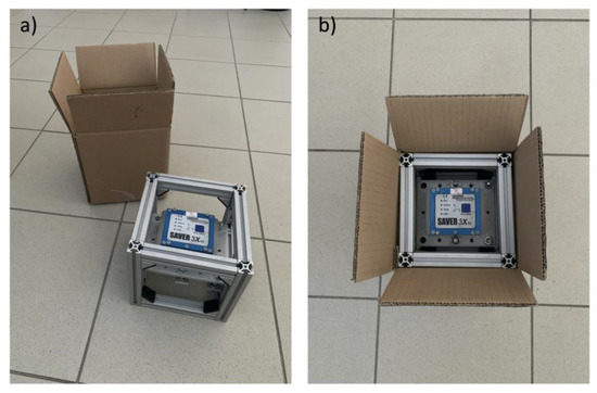 For this study three identical small, corrugated box parcels were set up for the measurements of the stacked unit. Each sample packaging contained a Lansmont SAVER 3 × 90 field data recorder (Lansmont Corp., Monterey, CA, USA), which was fixed to an aluminum frame (Figure 2). Inside the package this ITEM aluminum profile frame (©item Industrietechnik GmbH, Solingen, Germany) ensured the rigid fixation of SAVERs and the best fitting to the boxes’ geometrical sizes. Thereby, a total of four SAVERs were used for the measurements, three of the SAVERs were in the sample boxes and one of the SAVERs was mounted to the van’s platform directly. Table 1 describes the sample specifications and SAVER settings for this study.