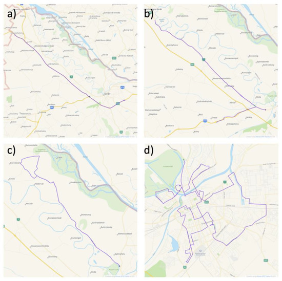 To collect the field vibration data four different route conditions were used. The measurements were performed on motorway, arterial road, country road and urban roads, respectively. The reason for choosing these categories is to compare the vibration levels between varied road conditions and to search for that vibration level which is closest to the accelerated laboratory circumstances. Each measurement was taken for an approximately 60 min period per routes. The measurements were executed at night only, so the van could maintain a relatively higher travelling speed due to less traffic. This is important due to the fact that a higher vehicle speed produces higher vibration intensity [4,12,13]. The routes for the measurements can be seen in Figure 4 and Table 2 contains information of distances and average vehicle speeds. The experiment was conducted from 6 to 7 August (2020) in the county of Győr-Moson-Sopron, Hungary.
