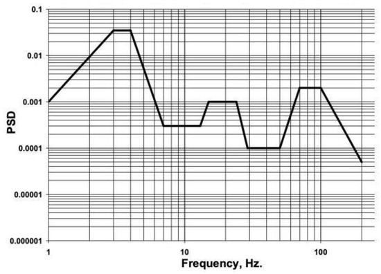The laboratory measurement was performed at the Packaging Laboratory, Hungary (University of Győr). The ASTM D7386 Standard Practice for Performance Testing of Packages for Single Parcel Delivery Systems (Figure 5) was programmed for the vibration system. This testing procedure is the one generally used for packed-products for parcel delivery shipment. This PSD spectrum simulates small vehicle vibration in the test procedure. The frequency range and overall Grms of this profile is 1–200 Hz and 0.46.