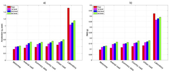 (a) Peak acceleration and (b) RMS acceleration values of the stacked unit and floor on different road conditions.