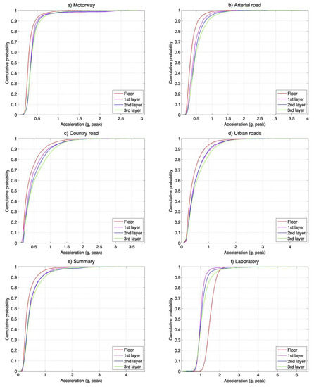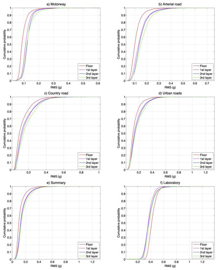 In terms of RMS data (Figure 8) it can be clearly visible that the functions of stacked layers almost coincide below 50% probability. The highest RMS value at this point was calculated in the 3rd layer on urban roads, it was 1.25 RMS (g), and on the floor the highest was 1.11 RMS (g). Comparing these values with the data obtained from the motorway these were approximately 1.9 times higher in each layer at the 90% occurrence level. As laboratory test results show 90% of the RMS values were below 0.51 RMS (g) on the floor, and 0.45, 0.47 and 0.49 RMS (g) from the 1st to 3rd layers and these values were 2.6, 1.8, 1.9, and 1.7 times higher than the values of the field summary data from floor to 3rd layer, where those were 0.20, 0.25, 0.26 and 0.28 RMS (g), respectively. Appendix A and Appendix B contains specifications for CDSs of each measurement that were conducted for this study.