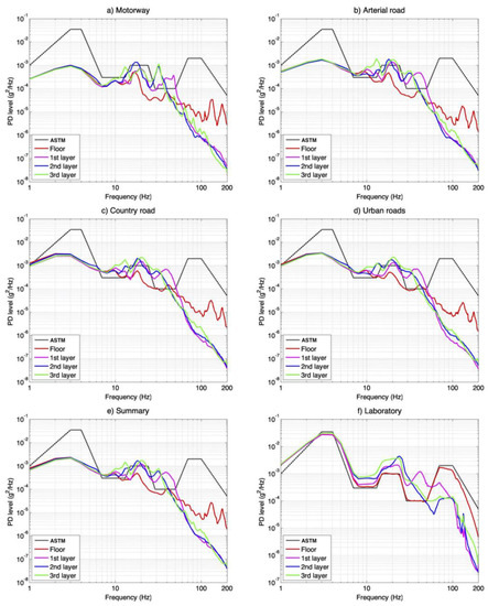 PSD plots of various layers in a stacked unit, on the floor and ASTM D7386 spectrum at, (a) Motorway, (b) Arterial road, (c) Country road, (d) Urban roads, (e) Summary, (f) Laboratory.