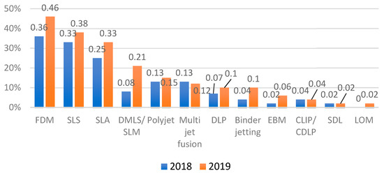 According to previous surveys and trends for the first quarter of 2019, Fused deposition modelling (FDM) technology still accounts for most additive manufacturing technologies, up to 46%. Despite the development of new technologies and designs, FDM technology increased compared to 2018. Excessive production of plastic waste is currently a global problem. There are now 12 different basic types of additive devices on the market (Figure 1). As a result, this technology’s demand, despite its now common occurrence, is growing in schools or households and various industries [1]. For this reason, the technology can also be considered as a significant producer of plastic waste, to which its “hobby” use also makes a significant contribution, which makes it difficult to monitor in this respect [2].