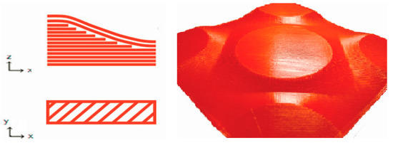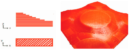 Nowadays, narrow groups of researchers specialising in FDM technology deal with this issue within institutions and companies. Autodesk is one of these companies. This company, which is one of the leaders and pioneers in CAD / CAM and CAE software, has since July 2018 officially registered patent no. US10005126B2. [10]. This patent describes the so-called “Systems and methods for enhanced 3D printing”. One of these methods uses a non-planar layering of the material shown in Figure 2 [8].