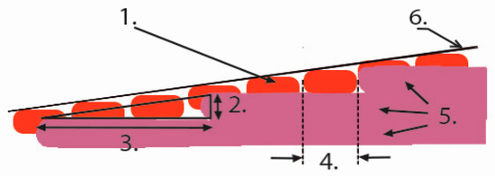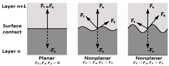 The nature of the resulting surface obtained by the non-planar method of layering the material allowed better prediction of mechanical properties of these models compared to conventional planar models. This obtained results from the variable orientation of the surfaces’ contact surfaces, which can lead to a change in the distribution of forces in the layers, e.g., under tensile stress. Planar regions created using FDM technology are usually less resistant to tensile stress. It follows from the same way of assembling the model from planar surfaces. This resistance is lowest in the direction of the Z-axis. Divide them into a mixture of tensile and shear forces, and the theoretical assumption of the distribution of these forces depending on the increased displacement of the layers caused by stress can be seen in Figure 5 [14,15].